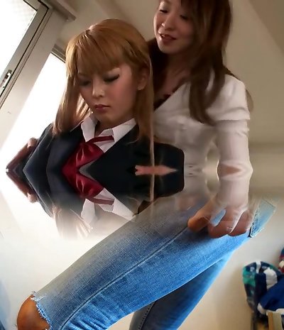 Japanese shemale shoves her partner's anal as she gives her a hj