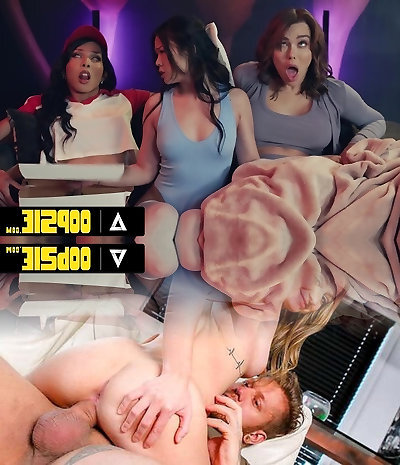 Two studs fuking butt while tranny bitch fucks a chick then bust cum load on her